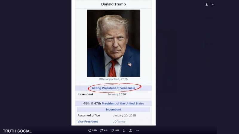 وفي تطور لافت، نشر ترامب صورة له من ويكيبيديا تحت عنوان “رئيس فنزويلا بالوكالة”، ملمحا بسخرية إلى شرعية ديلسي رودريغير، نائبة الرئيس نيكولاس مادورو، والتي تولت زمام السلطة بعد اعتقاله في 3 يناير على يد قوة أمريكية خاصة.