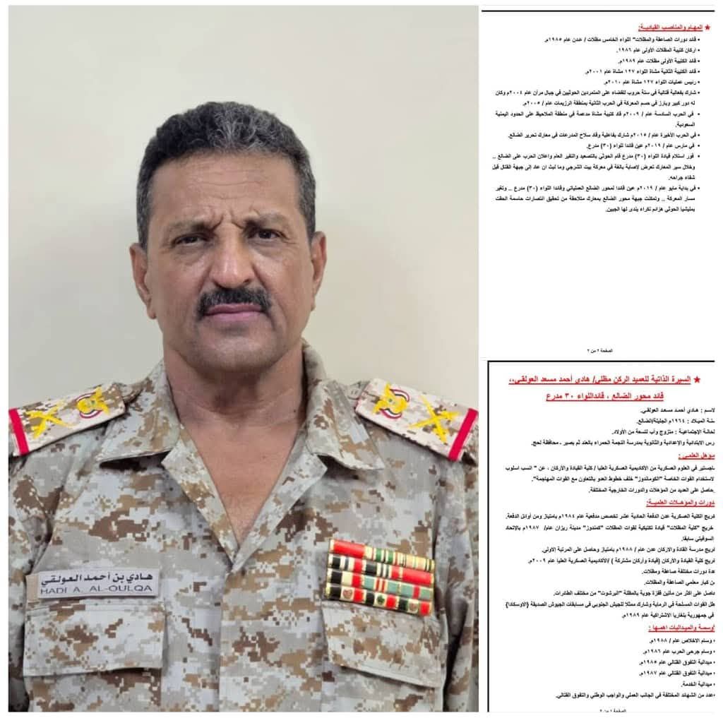 وتطرقت القيادة المهنئة الى السجل الحافل والبطولات الذي سطرها القائد هادي العولقي في الدفاع عن الوطن والحفاظ على المؤسسة العسكريةوكان من القادة الاوفياء الذين سجلوا مواقف خالدة في الدفاع والذود والتضحية لأجل الوطن، ومن خيرة قادة الجيش الذين وقفوا ببسالة وبذلوا جهود كبيرة في الدفاع عن الوطن مع رفقاء السلاح من قيادة الجيش والمقاومة