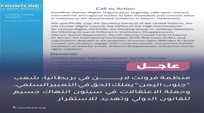 دعت منظمة فرونت لاين لحقوق الإنسان، ومقرها لندن في المملكة المتحدة، الجهات الدولية والإقليمية المعنية إلى اتخاذ إجراءات فورية وملموسة إزاء الانتهاكات الموثقة في مدينة سيئون بمحافظة حضرموت.
