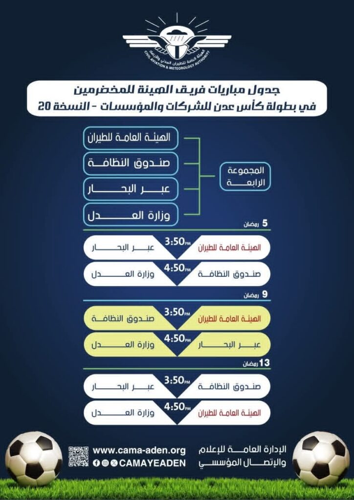 يكثف فريق الهيئة العامة للطيران المدني والأرصاد تحضيراته للمشاركة في بطولة كأس عدن للشركات والمؤسسات لكرة القدم الخماسية (النسخة العشرون)، المقرر انطلاقها في الثاني من شهر رمضان المبارك، بمشاركة واسعة لفرق الشركات والمؤسسات في العاصمة المؤقتة عدن.