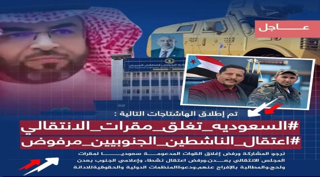 أطلق ناشطون وسياسيون جنوبيون حملة إلكترونية وإعلامية على مواقع التواصل الاجتماعي تحت وسم #السعوديه_تغلق_مقرات_الانتقالي #واعتقال_الناشطين_الجنوبيين_مرفوض.