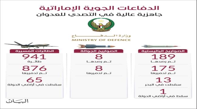 الإمارات : دفاعاتنا الجوية تتصدى بكفاءة لـ 1130 صاروخاً ومسيرة منذ بدء العدوان الإيراني