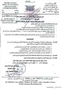 أصدر وزير الدولة محافظ عدن عبدالرحمن شيخ، القرار رقم 27 لسنة 2026، بشأن تعيين قيادة لوحدة التدخل بمشكلات الأراضي.