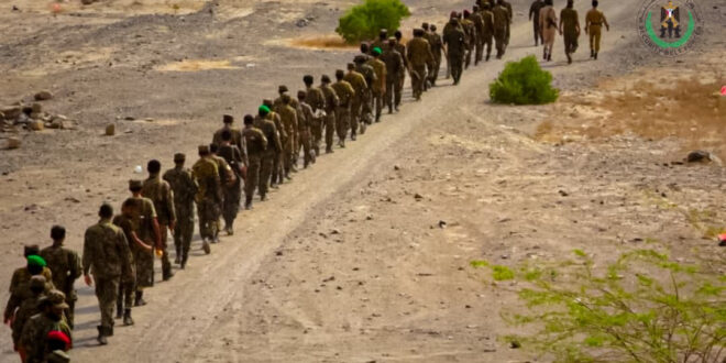 قوات التدخل السريع بالحزام الأمني تنفذ مسيرا عسكريا بأبين