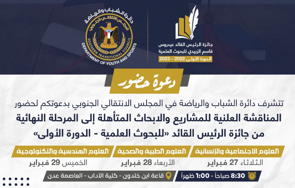 وستحتضن قاعة ابن خلدون في كلية الآداب / جامعة عدن فعاليات المناقشة العلنية للمشاريع المتأهلة للمرحلة النهائية من جائزة الرئيس القائد عيدروس قاسم الزُبيدي للبحوث العلمية من كل الفئات الإجتماعية والإنسانية والطبية والهندسية، حيث ستبدأ المناقشة العلنية يوم الثلاثاء 27/2/2024 بالفئة الاجتماعية والإنسانية، تليها الفئة الطبية يوم الأربعاء 28/2/2024 ، ثم الفئة الهندسية التي ستكون ختام للمرحلة النهائية للجائزة يوم الخميس القادم 29/2/2024 .