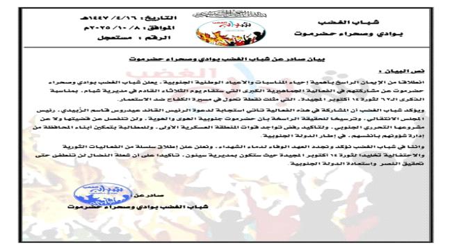 وأضاف البيان أن فعالية سيئون القادمة تمثل محطة جديدة من محطات النضال الثوري الجنوبي، مؤكدًا أن شباب الغضب سيشاركون بقوة ضمن الحشود الجنوبية الواسعة التي ستتوافد من مختلف مناطق الوادي والصحراء لإحياء هذه الذكرى الغالية.