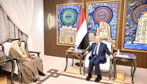 استقبل الدكتور رشاد محمد العليمي، رئيس مجلس القيادة الرئاسي، اليوم الاثنين، سفير دولة الامارات العربية المتحدة لدى اليمن، محمد حمد الزعابي.