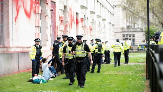 اعتقلت الشرطة البريطانية 5 أشخاص للاشتباه في تسببهم بأضرار إجرامية الأربعاء إثر رش مقر وزارة الدفاع في لندن بالطلاء الأحمر احتجاجا على مواصلة بريطانيا بيع الأسلحة لإسرائيل.