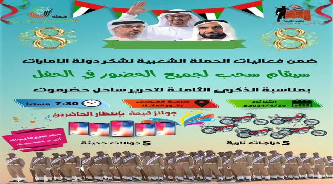 ضمن فعاليات الذكرى الـ(8) لتحرير ساحل حضرموت..الثلاثاء.. حفل جماهير بالمكلا لشكر دولة الإمارات والسحب على جوائز