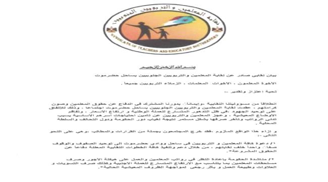بيان صادر عن نقابة المعلمين والتربويين الجنوبيين بساحل حضرموت.