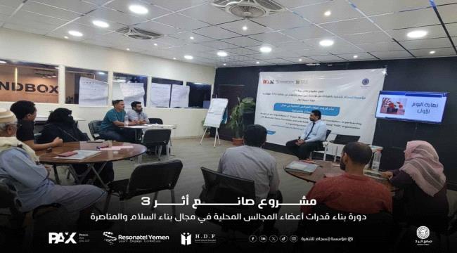 دشنت مؤسسة انسجام للتنمية، الأربعاء، بالعاصمة عدن دورة تدريبية بعنوان “بناء قدرات المجالس المحلية في مجال السلام والمناصرة”، ضمن إطار مشروع “صانع أثر 3” في مرحلته الثالثة، وذلك بالتعاون مع مؤسسة رنين وبدعم من منظمة PAX الهولندية.