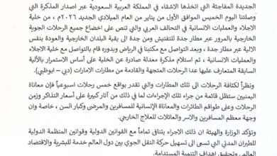 بيان صادر عن وزارة النقل بشأن إخضاع جميع الرحلات الجوية الخارجية بالمرور عبر مطار جدة للتفتيش