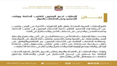 أعربت دولة الإمارات عن قلقها بظل التطورات الأخيرة في حضرموت، وأسفها إزاء التصعيد القائم، داعية إلى وقف التصعيد وتغليب لغة…