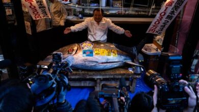 بيعت سمكة تونة ذات زعانف زرقاء تزن 243 كيلوغراماً (535 رطلاً) بسعر قياسي بلغ 510 ملايين ين (3.2 مليون دولار)…