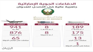 أعلنت وزارة الدفاع أن الدفاعات الجوية الإماراتية تعاملت، أمس، بنجاح مع 3 صواريخ باليستية، ورصدت 129 طائرة مسيرة تم اعتراض…