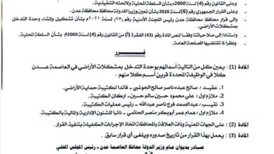 أصدر وزير الدولة محافظ عدن عبدالرحمن شيخ، القرار رقم 27 لسنة 2026، بشأن تعيين قيادة لوحدة التدخل بمشكلات الأراضي. وقضت…